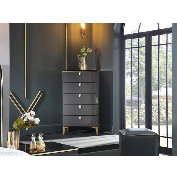 - Комод Carlino 5 ящиков — это высокий комод, который выполнен в современном стиле, с акцентным золотым декором на корпусе и фурнитуре, что придаёт модели изысканный вид.
