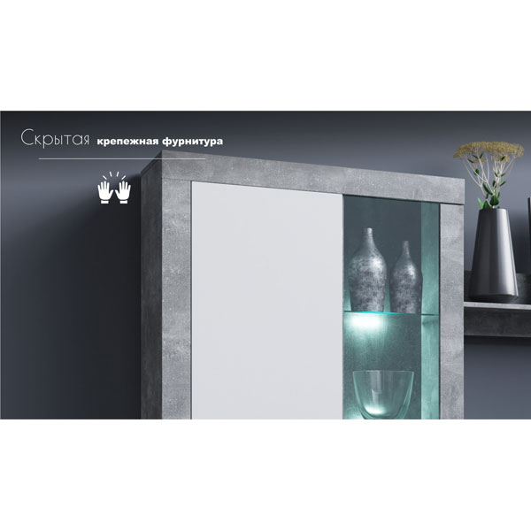 - Удачное и стильное цветовое решение - белые фасады с полками и корпусом под бетон.