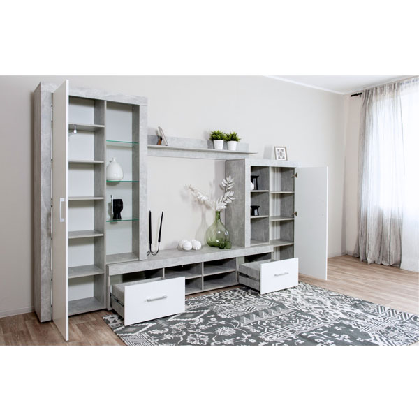 - При своей относительной компактности, имеет все необходимые элементы хранения - платяной шкаф, множество полок, витрины, ниша под ТВ и ящики!