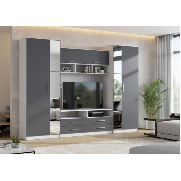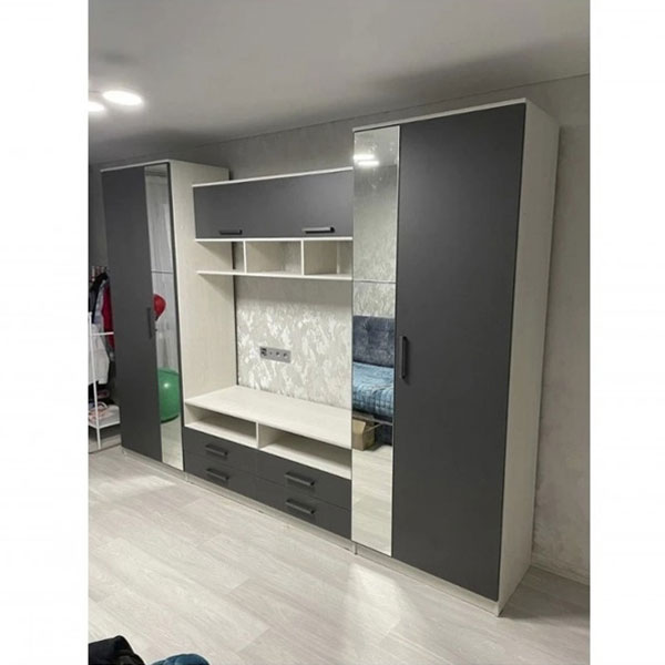 - Гостиная выполнена в цвете: корпус анкор белый, фасад графит, на фасаде шкафов по три декоративных вставки зеркало.