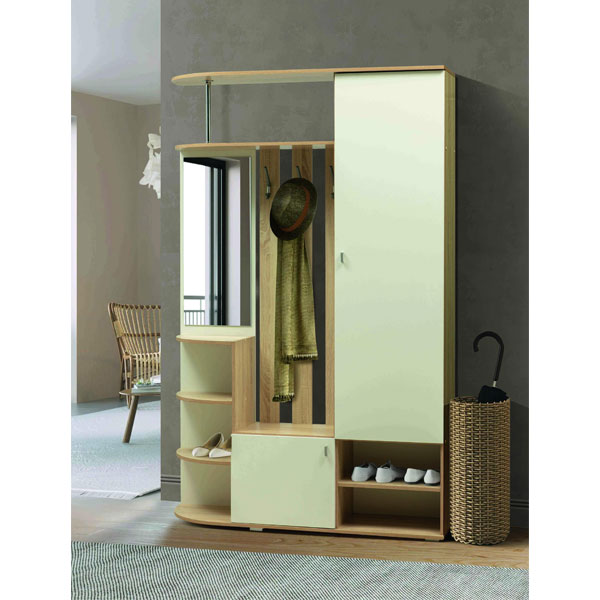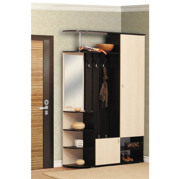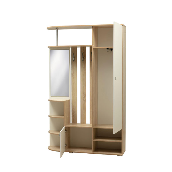 - Справа располагается вместительный отдел с глухой дверцей, под которым предусмотрена открытая ниша с полкой, где можно хранить обувь или сумки.