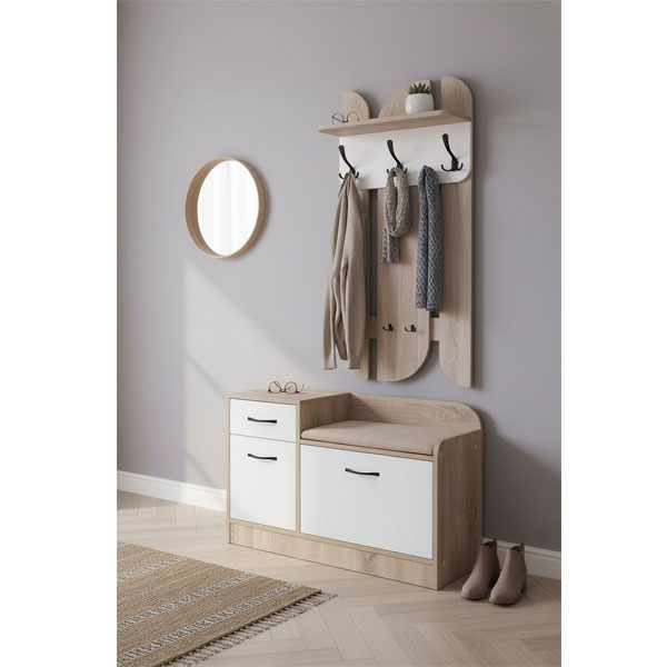 - Вешалка оборудована полкой для головных уборов, тремя большими крючками для одежды и двумя малыми дополнительными крючками для сумок и зонтов.