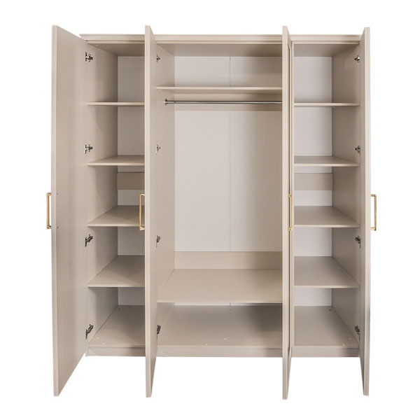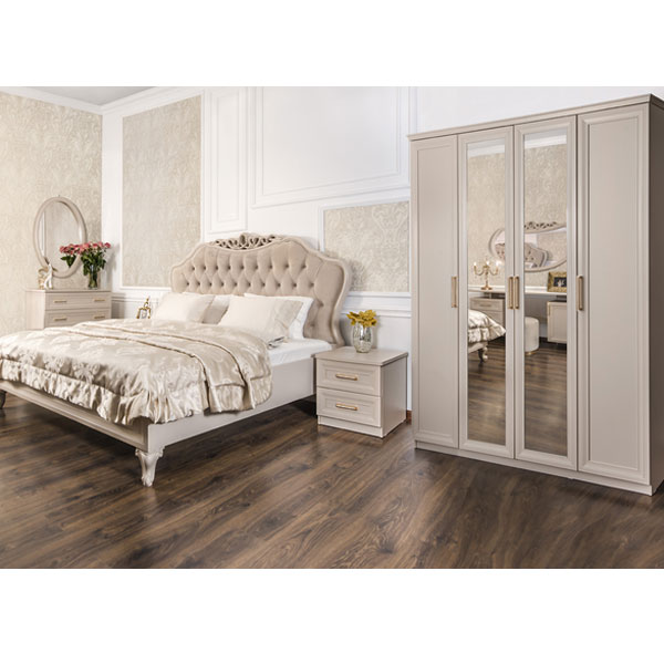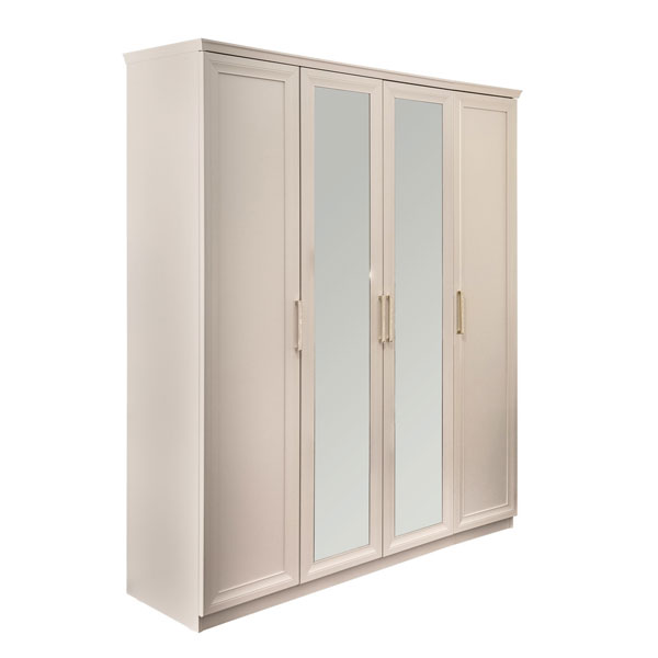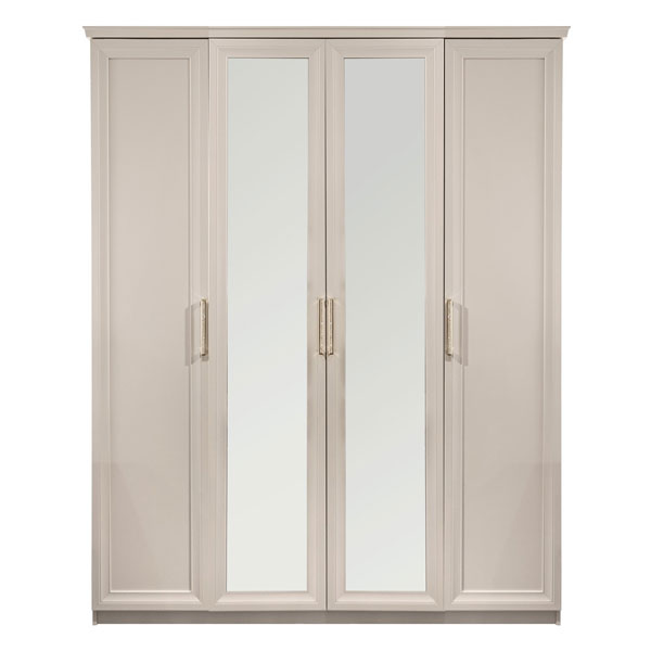 - Шкаф 4-ств с зеркалами Мокко - элегантный комфортный шкаф в комплектации 1+2+1 выполнен в стиле современная классика с двумя боковыми отделениями с полками для белья за распашными дверцами и с центральным отделением со стационарной штангой и двумя полками за двумя распашными зеркальными дверцами.