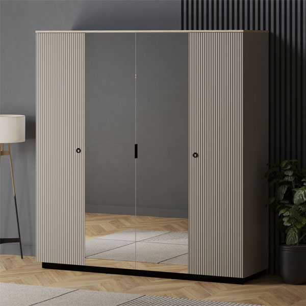 - В центральной части шкафа — 2 зеркальные двери со скрытыми ручками; здесь размещена металлическая штанга для одежды и 2 вместительные полки.