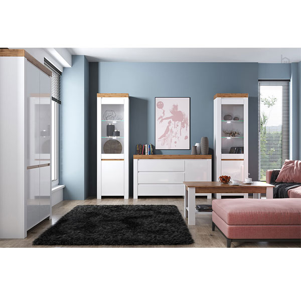 - Сочетание белого матового цвета с натуральным дубом вотан придает гостиной легкость, свежесть, уюта и красоту.