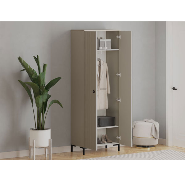- За 2 распашными дверями расположена выдвижная металлическая штанга для одежды и 2 вместительные полки.