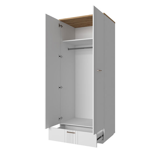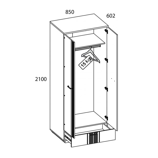 - Конструкция шкафа прямая, представляет собой одно гардеробное отделение за двумя глухими дверями с полкой и стационарной продольной штангой, один выдвижной ящик.