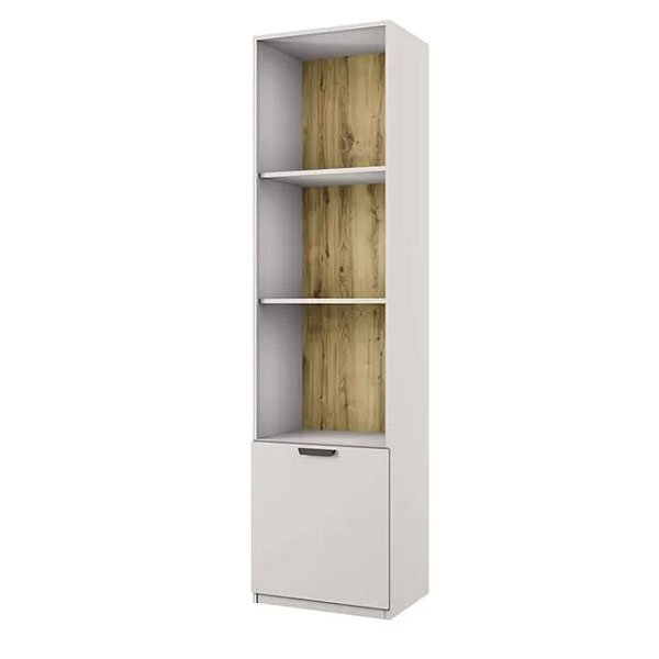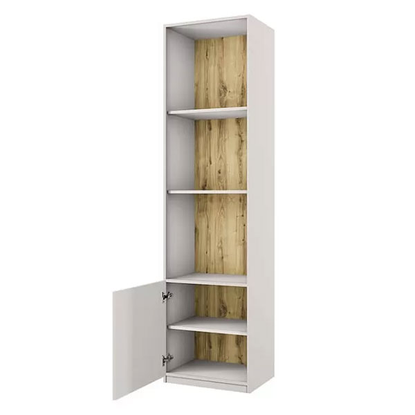 - Одностворчатый шкаф укомплектован полками. Дверцы установлены на петли с доводом, обеспечивающим медленное и бесшумное закрывание. Эта модель впишется в небольшое пространство гостиной и рабочего кабинета современного стиля. При необходимости ее дверь можно перевесить на левую или правую сторону.