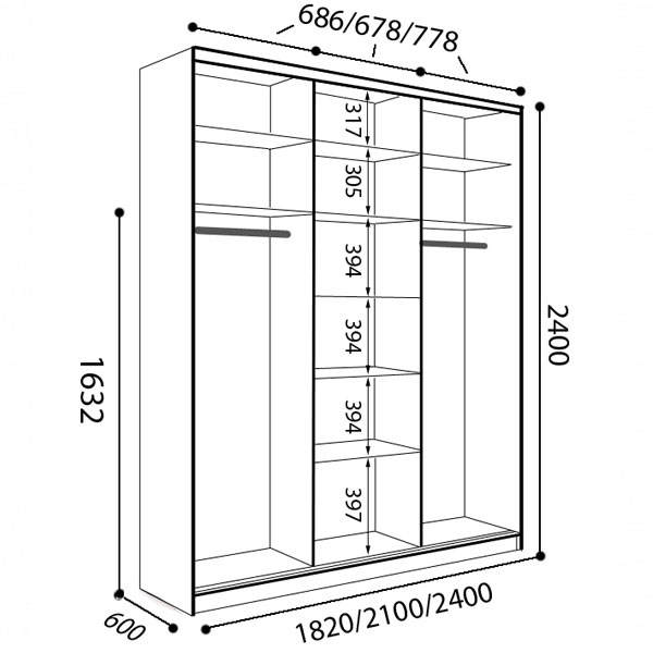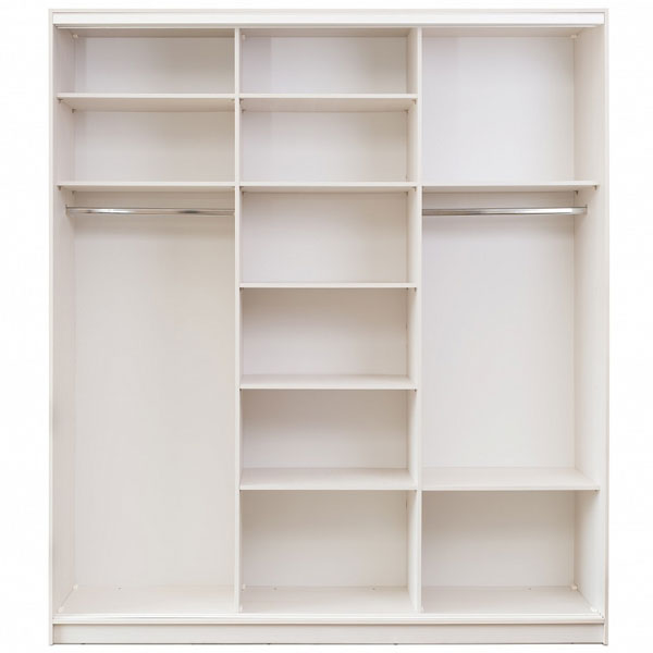 - Наполнение представлено тремя отсеками: по бокам размещаются отделения для одежды, комплектующиеся штангами, по центру – 6 полок.