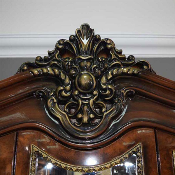 - Венчает сервант высокий благородный резной карниз с лепным картушем.