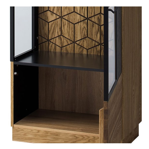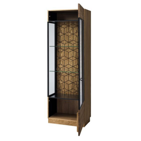 - Задняя стенка за стеклянными полками украшена оригинальным геометрическим узором.