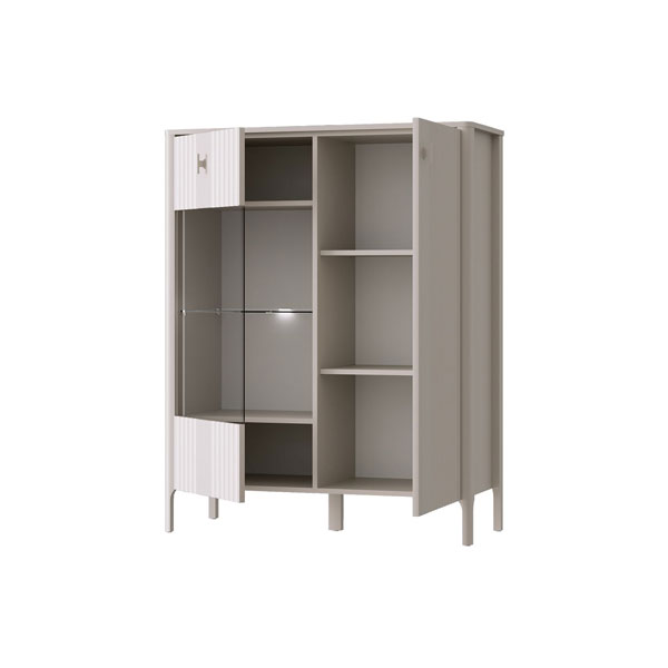 - Слева: 1 распашная дверь со стеклянной вставкой (витрина), за которой расположены 4 отделения для хранения.