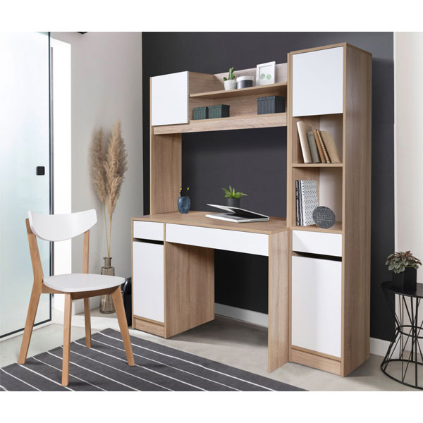 - Стеллаж укомплектован выдвижным ящиком и двумя закрытыми секциями с дверями. Нижняя секция разделена полочкой. Также есть открытая ниша, в которой разместятся книги или предметы декора.