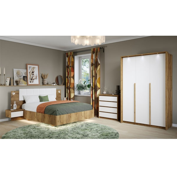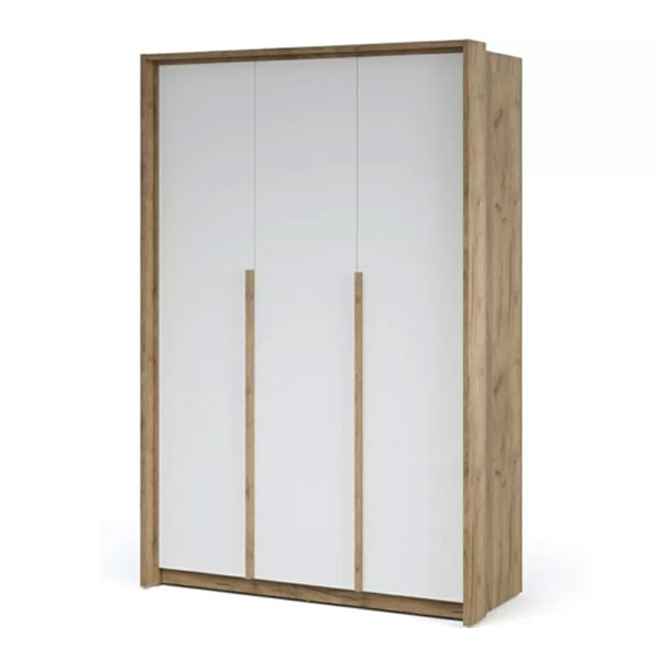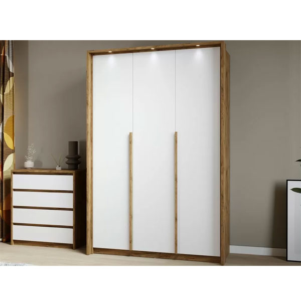 - Шкаф Мишель 3-дверный дуб крафт золотой/белый жемчуг — функциональный распашной шкаф с массивными ручками контрастного цвета.