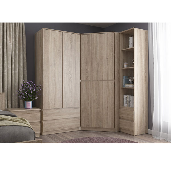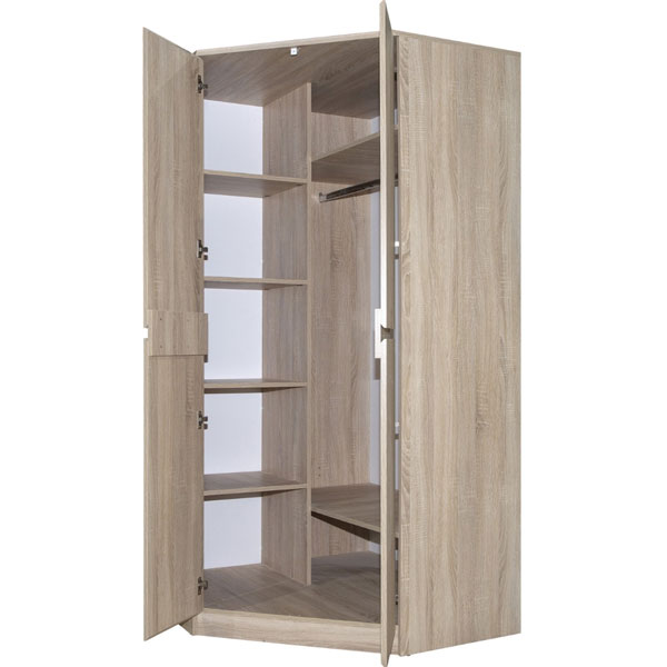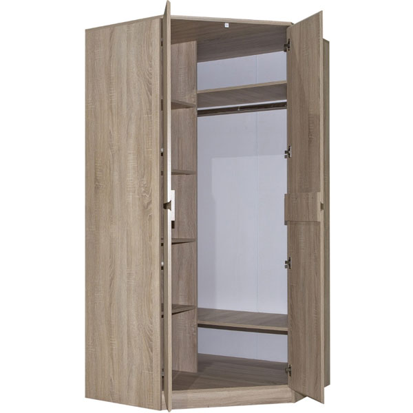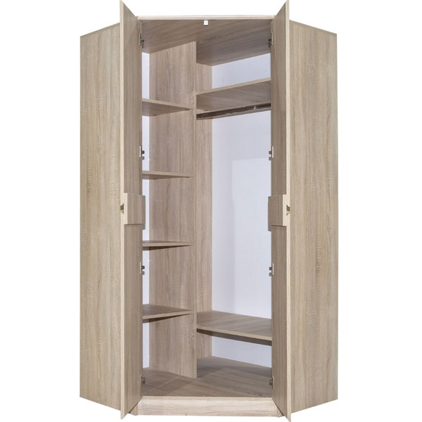 - Комбинированный угловой шкаф отличается продуманной конструкцией и двумя вместительными отделениями – отсеком для одежды с горизонтальной штангой и стеллажом с полками, на которых можно разместить документы и книги.