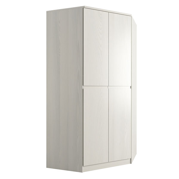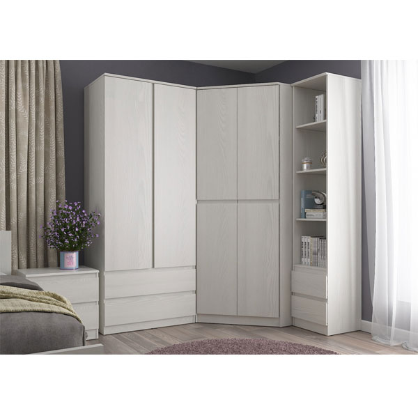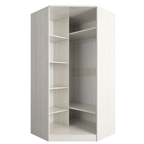 - Комбинированный угловой шкаф отличается продуманной конструкцией и двумя вместительными отделениями – отсеком для одежды с горизонтальной штангой и стеллажом с полками, на которых можно разместить документы и книги.