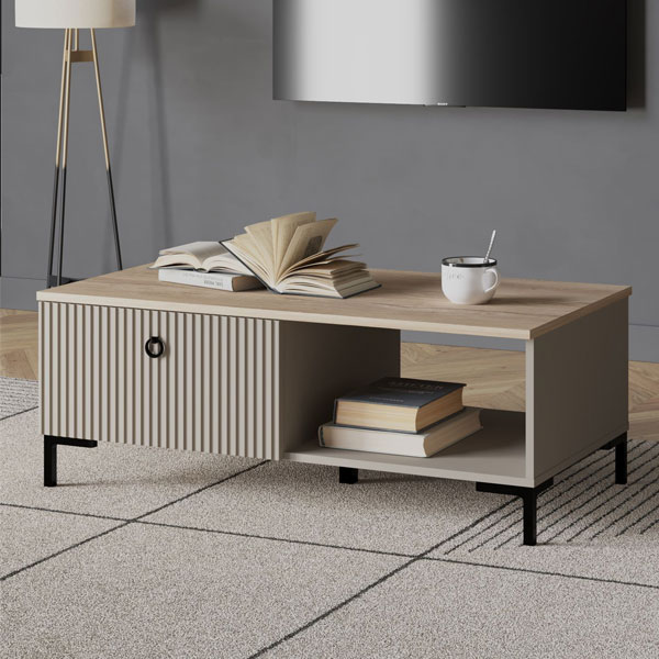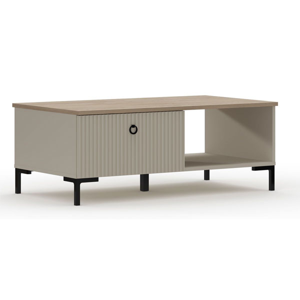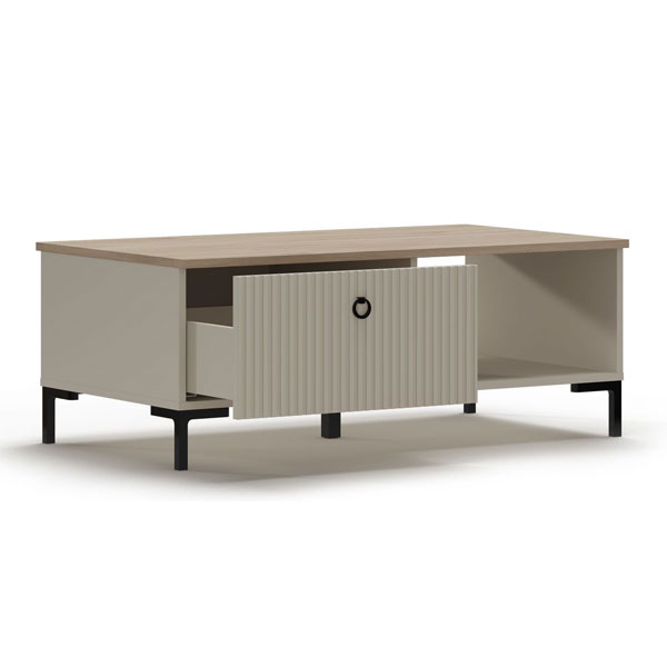 - В левой части выдвижной ящик на шариковых направляющих частичного выдвижения с рифлеными фасадами, в правой — открытое отделение для хранения.