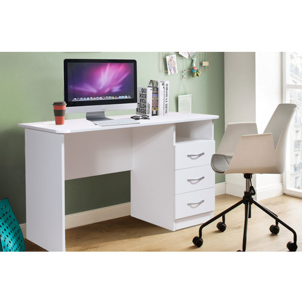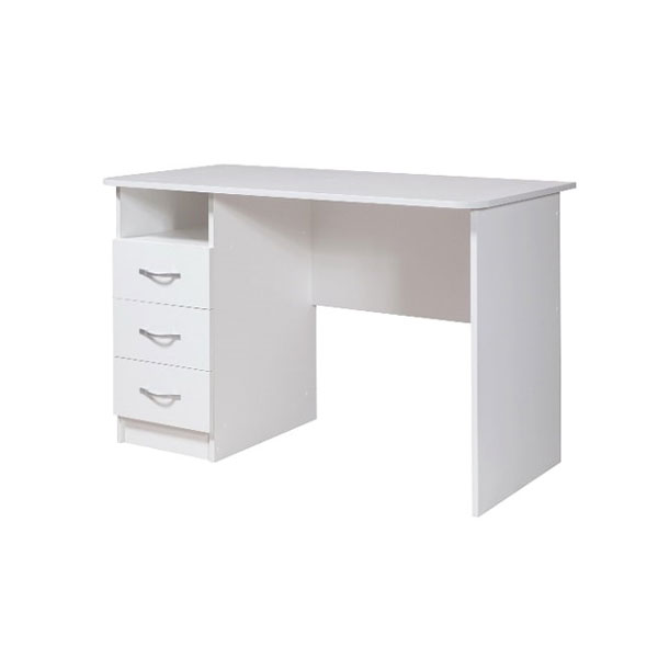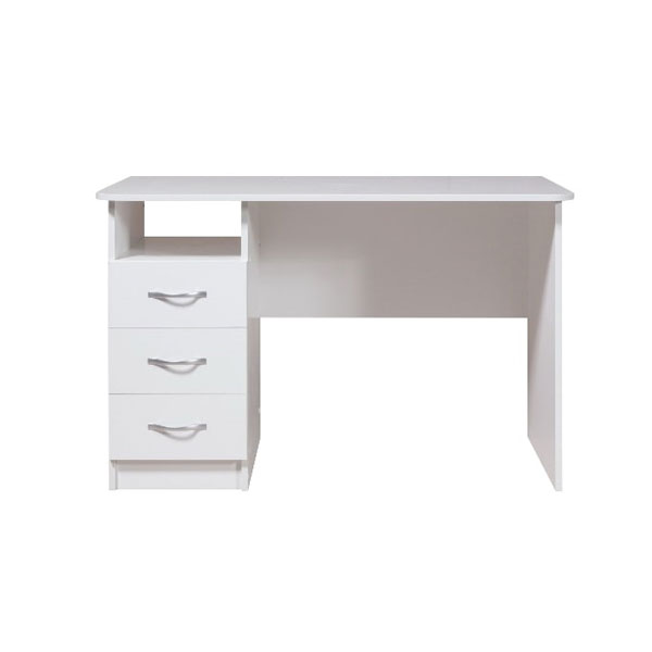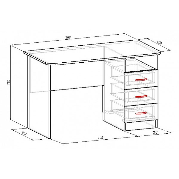 - Под широкой столешницей стола разместилась тумбочка с тремя выдвижными ящиками и открытой нишей.