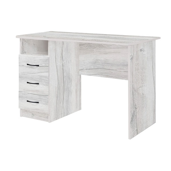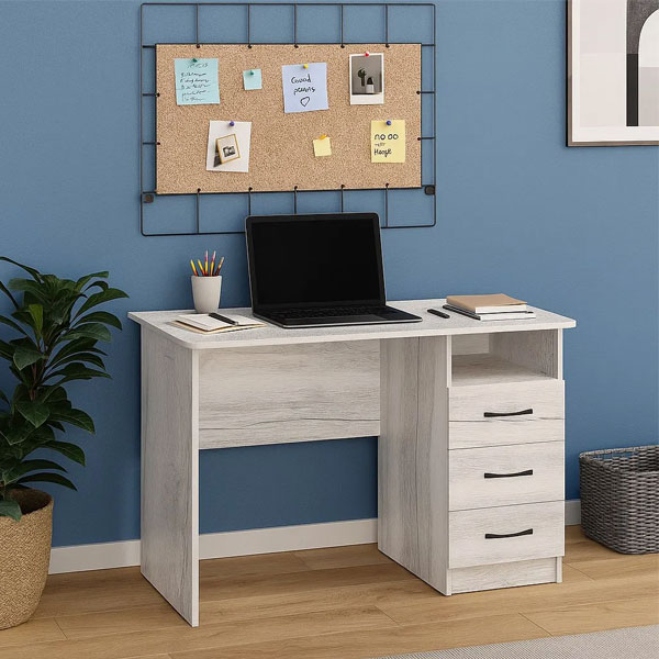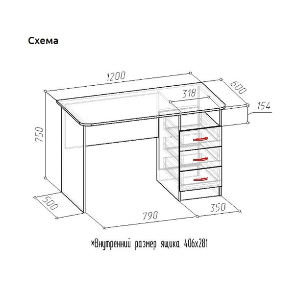 - Под широкой столешницей стола разместилась тумбочка с тремя выдвижными ящиками и открытой нишей.