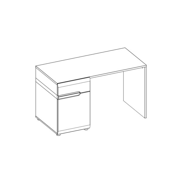 - Конструкция элемента представляет собой столешницу прямоугольной формы, тумбу с выдвижным ящиком и полкой из ЛДСП за глухой дверью (тумба устанавливается слева), справа – опора.