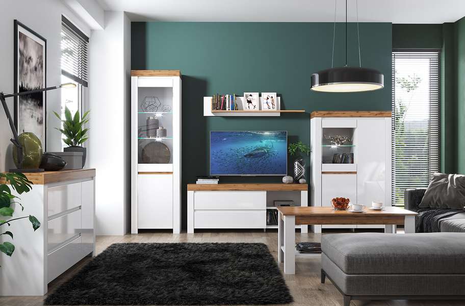 - Сочетание белого матового цвета с натуральным дубом вотан придает гостиной легкость, свежесть, уюта и красоту.
