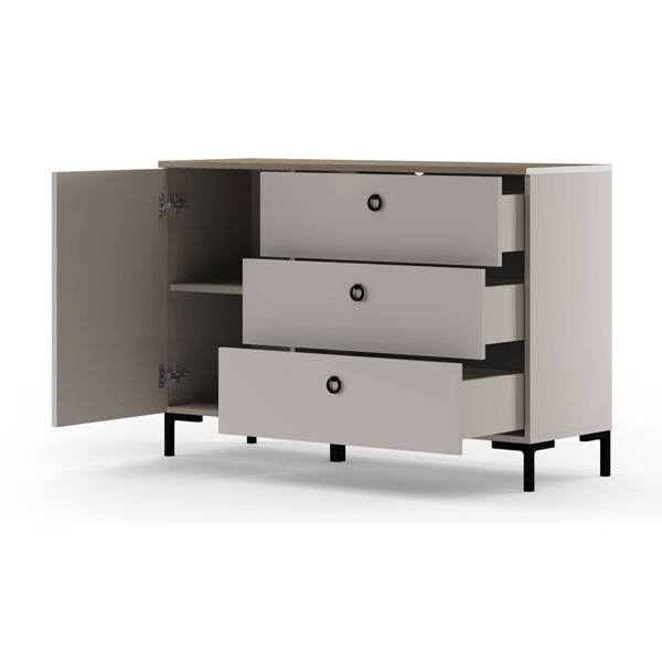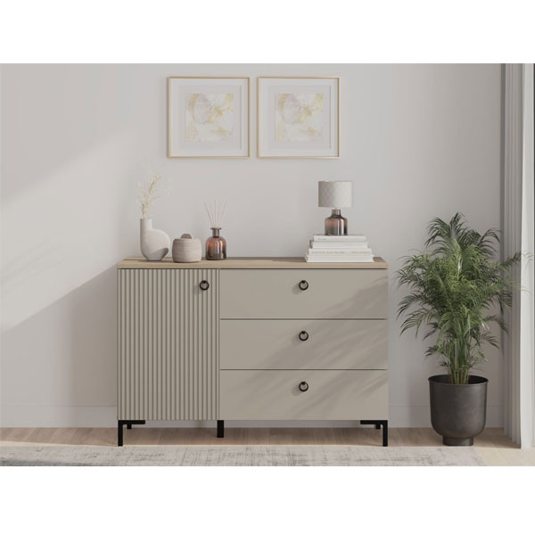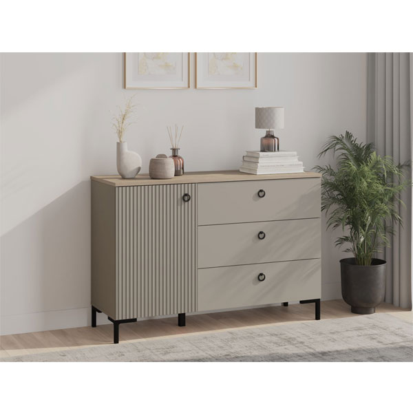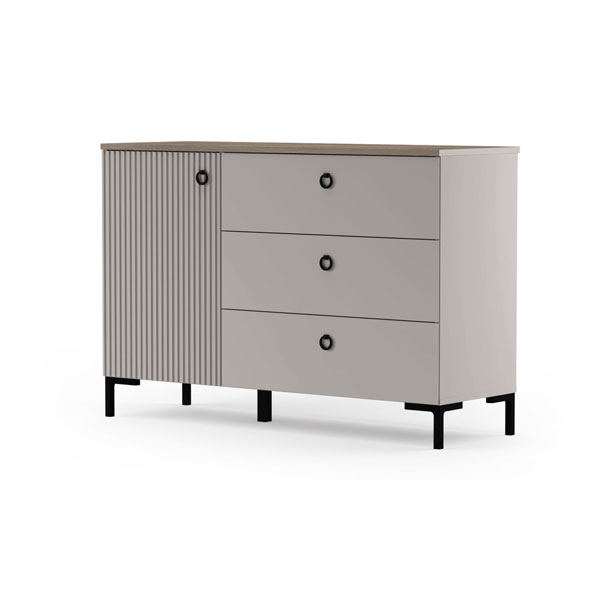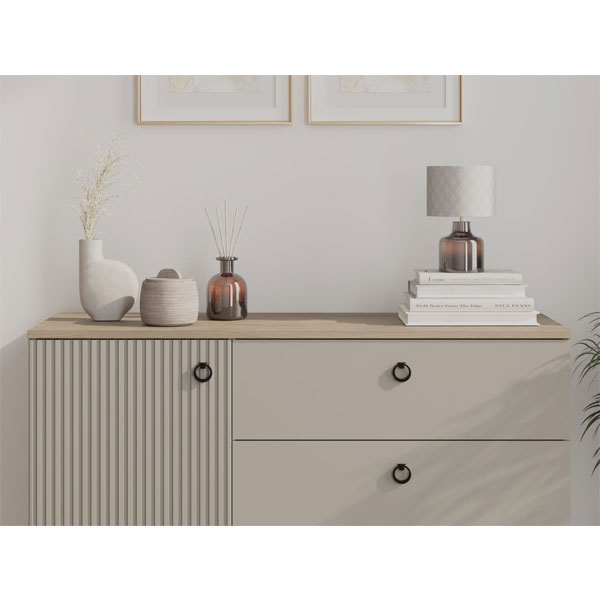 - В левой части тумбы — распашная дверь с рифлеными фасадами, за которой 2 вместительных отделения для хранения.