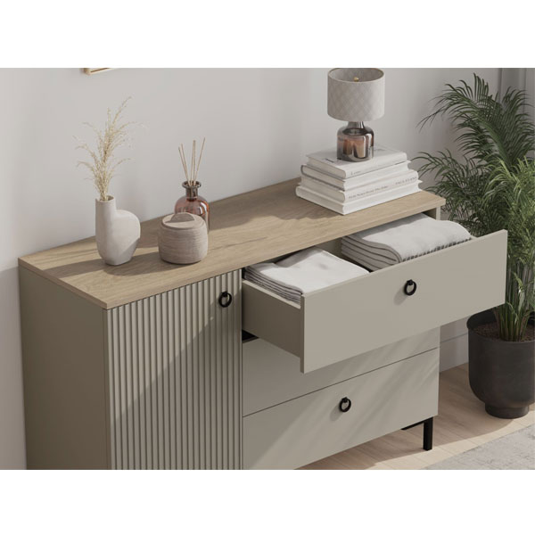 - В правой части 3 выдвижных ящика на шариковых направляющих частичного выдвижения с рифлеными фасадами, бесшумное закрывание.