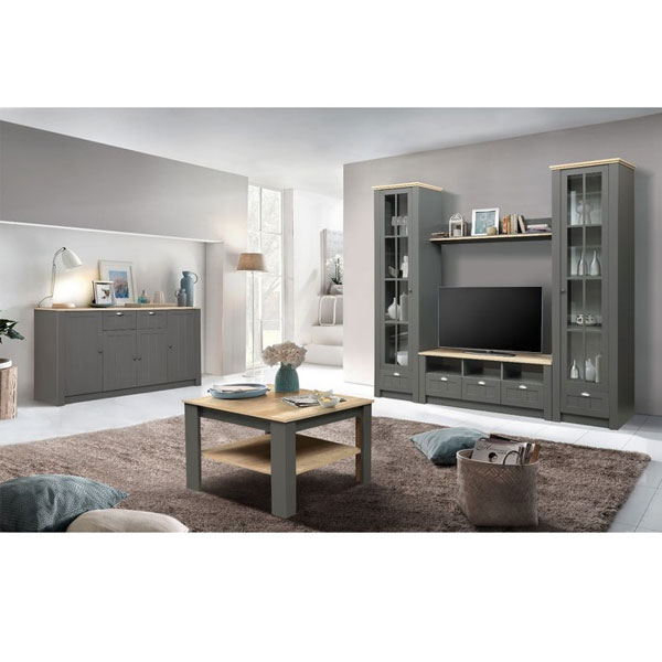 - Тумба выполнена из ЛДСП в тонировке диамант серый с фасадами, имитирующими реечные, в обрамлении МДФ-профиля в тонировке диамант и столешницей в тонировке дуб каньон.