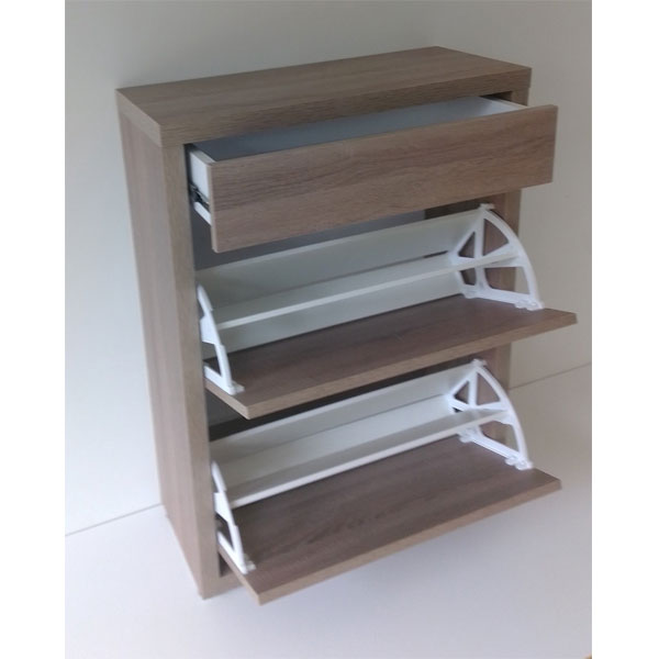 - Тумба для обуви Анрат "Элана" имеет два откидных отделения для хранения обуви, за дверью фасада обувницы расположено поворотное устройство под обувь, образующее при открывании две ниши для хранения обуви.