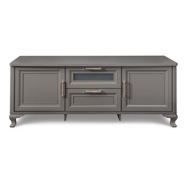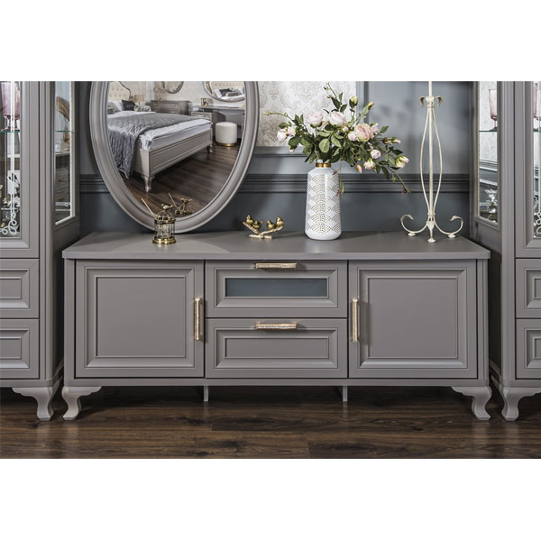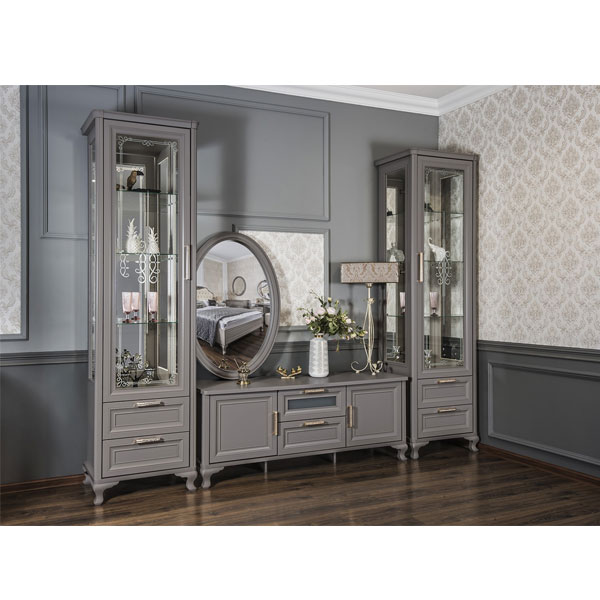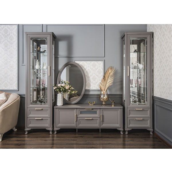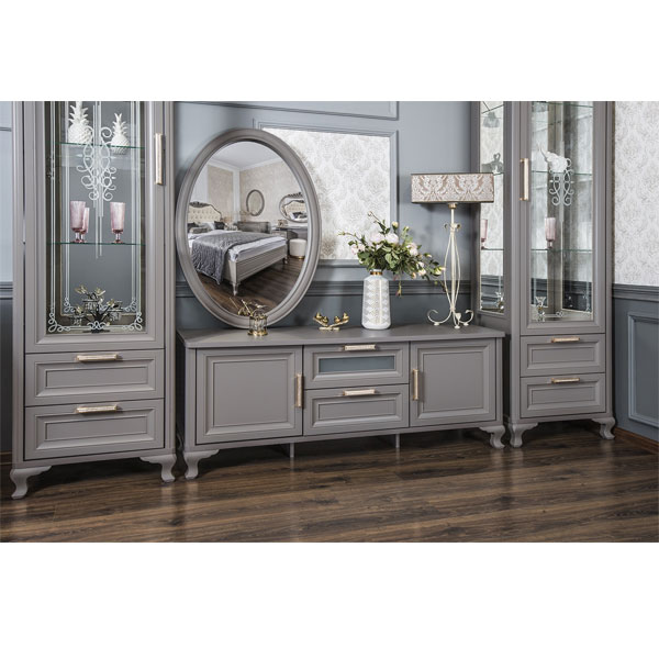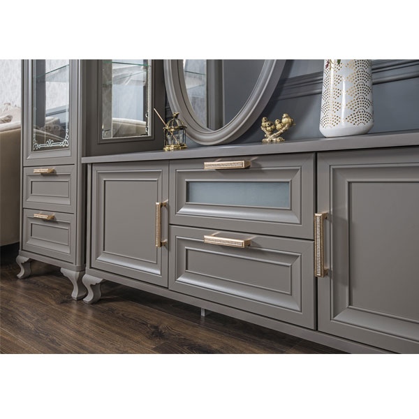 - Гладкая поверхность, декор на стеклах и латунные ручки со стразами, в которых переливаются лучи света.