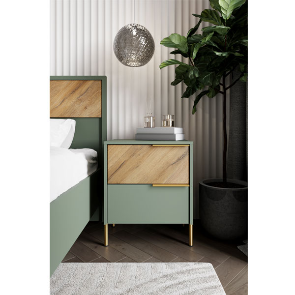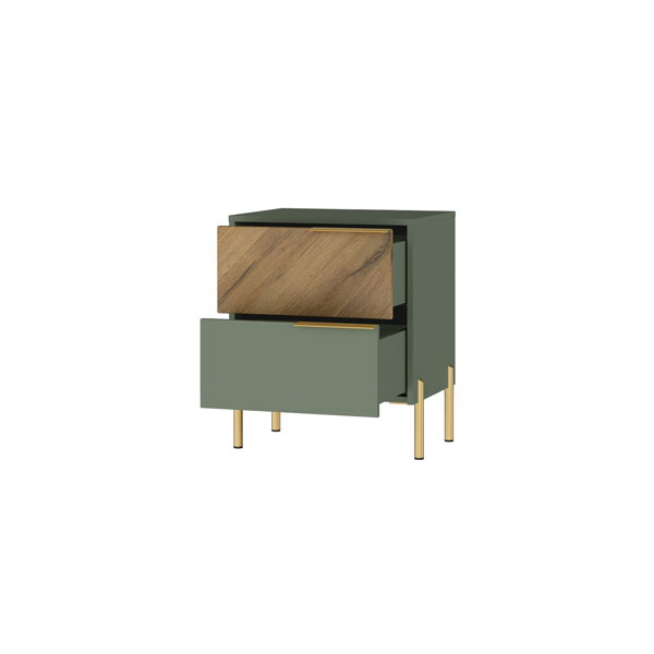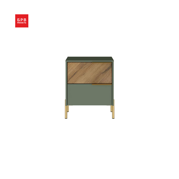 - Тумба отличается стильным сочетанием фасадов цвета дымчатый зеленый (матовый однотонный) и фасадов в цвете дуб вотан с текстурой дерева.