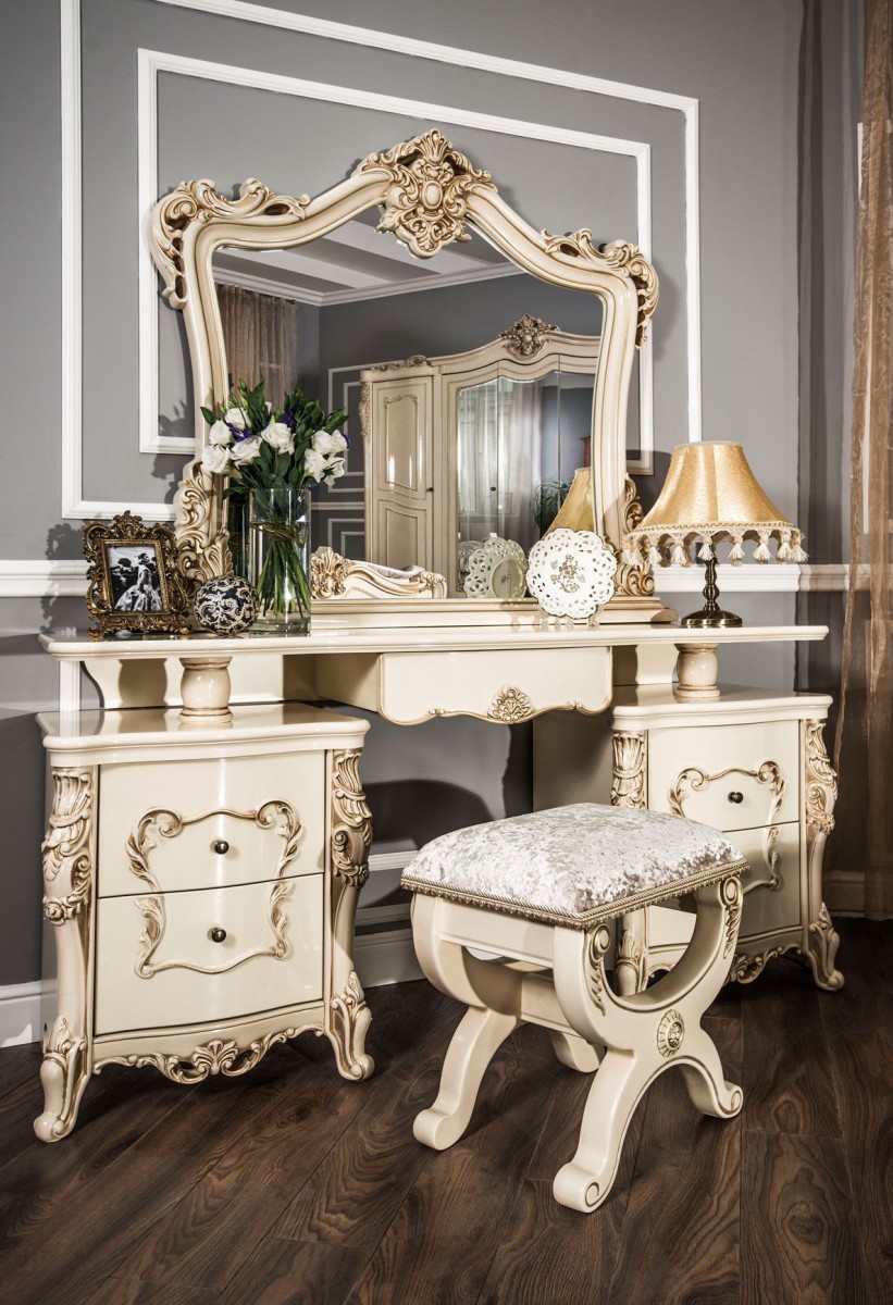 Мебель для спальни «Джоконда» не отличается прямыми линиями, здесь все очертания имеют криволинейные формы, преобладает архитектурный декор со сложными спиралями и витыми колоннами. Это дворцовый стиль, который использовали люди высшего класса в своих домах.