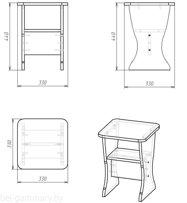 Ножки табуретки изготовлены из ламинированного ДСП с кромкой ПВХ, крышка – МДФ, покрытая пленкой ПВХ.