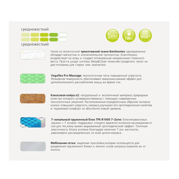 - Ортопедический эффект усиливается благодаря 7 зонам поддержки в независимом пружинном блоке.