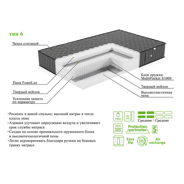 - Матрас «Тип 6» – это роскошный и доступный матрас для тех, кто ценит уют.