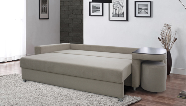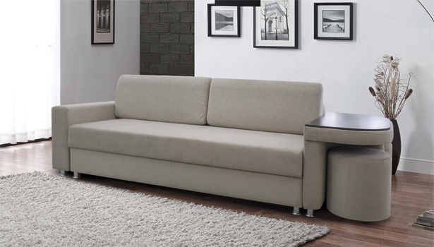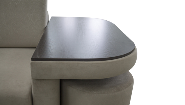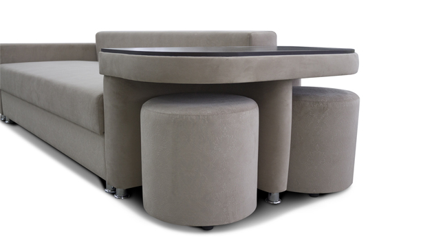 -Модель оснащена ящиком для хранения белья, а также оборудована столиком из ЛДСП в комплекте с двумя удобными банкетками, что значительно расширяет функциональные возможности дивана.