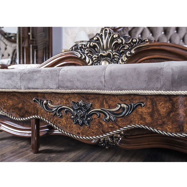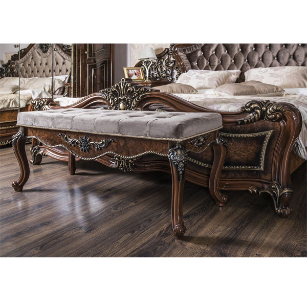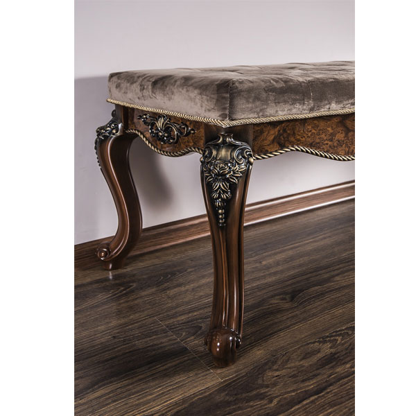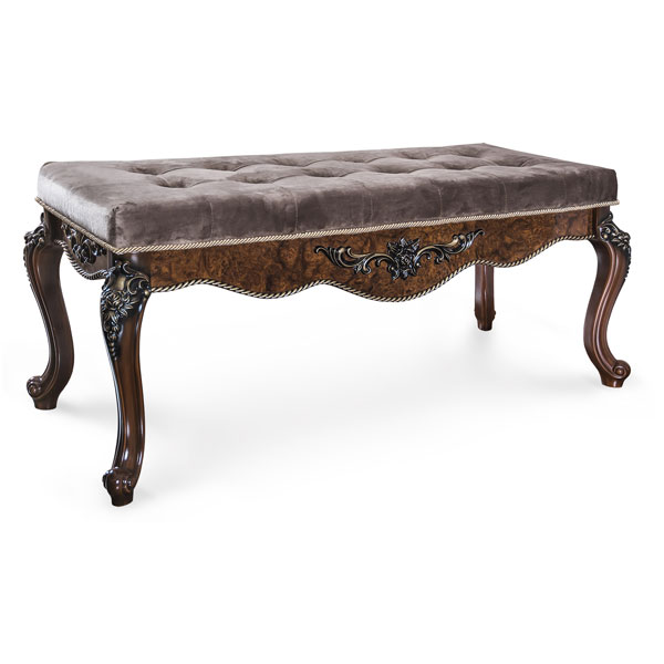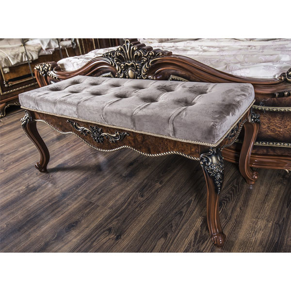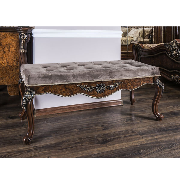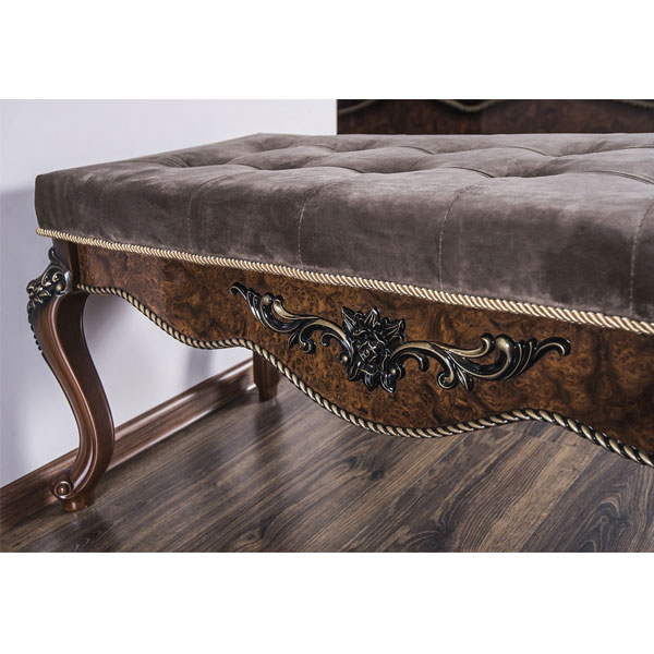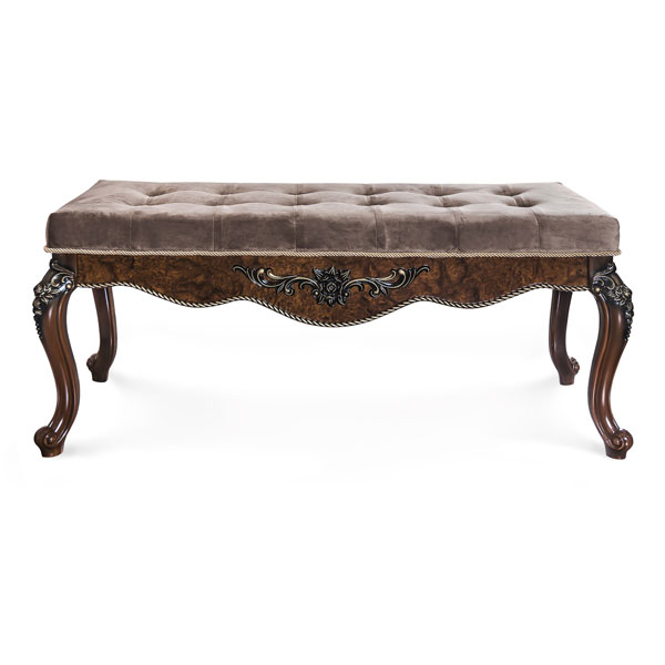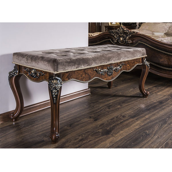 - Прикроватная банкетка «Джоконда» ‑ лучшее решение для классического барокко. Она изящна и самодостаточна, имеет объемную форму и фигурные ножки с элементами лепнины. Если раньше такую мебель использовали на светских балах и в будуарах, то сегодня ее устанавливают в спальнях и залах у подножья кровати, рядом с туалетным столиком или диваном.