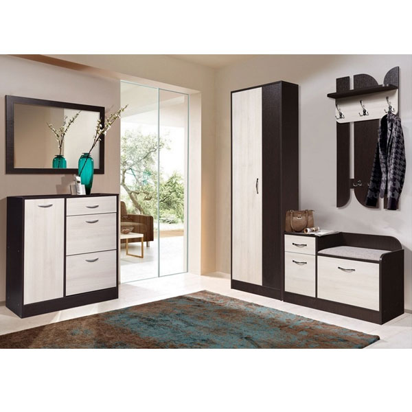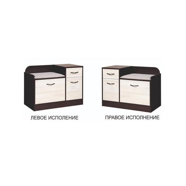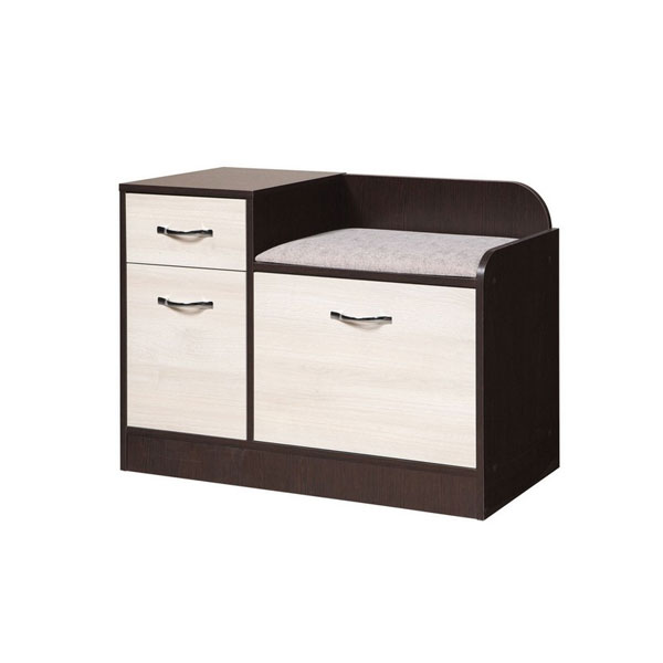 - Скамья оборудована вместительным двухсекционным отделение для обуви за откидной дверью, отделением для хранения высокой обуви за распашной дверью и выдвижным ящиком для хранения мелочей.