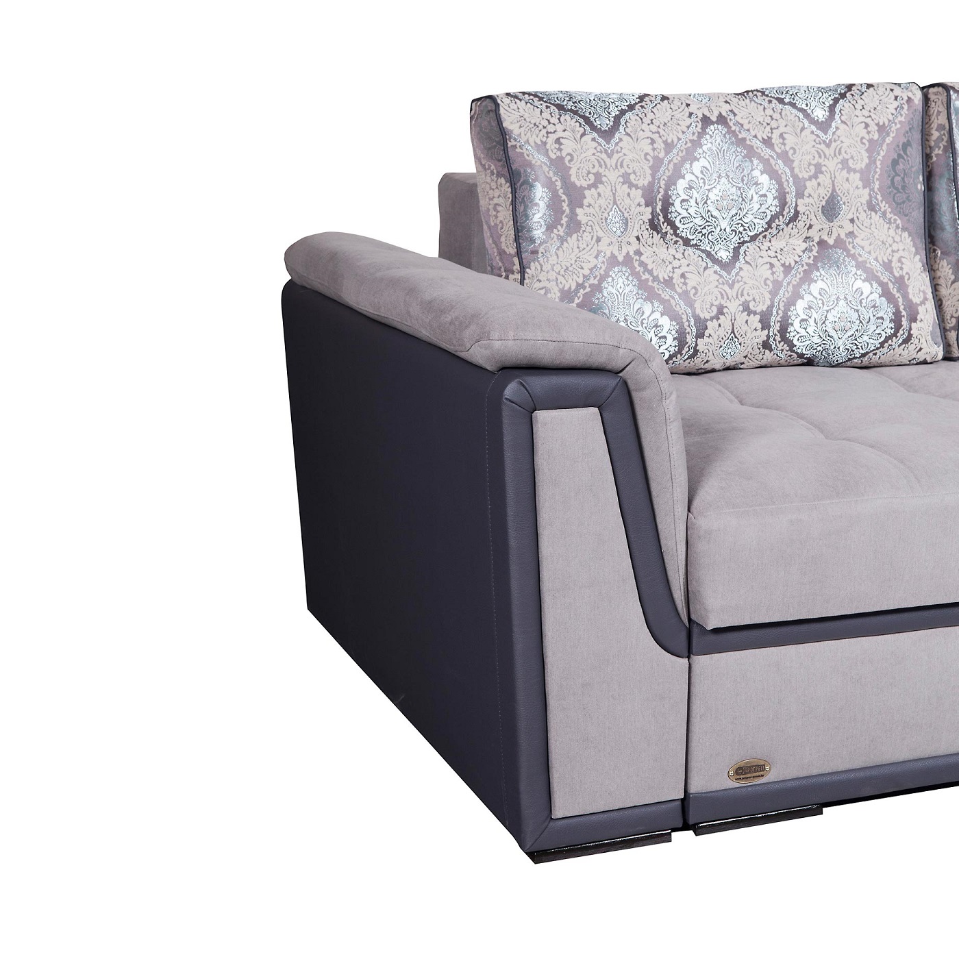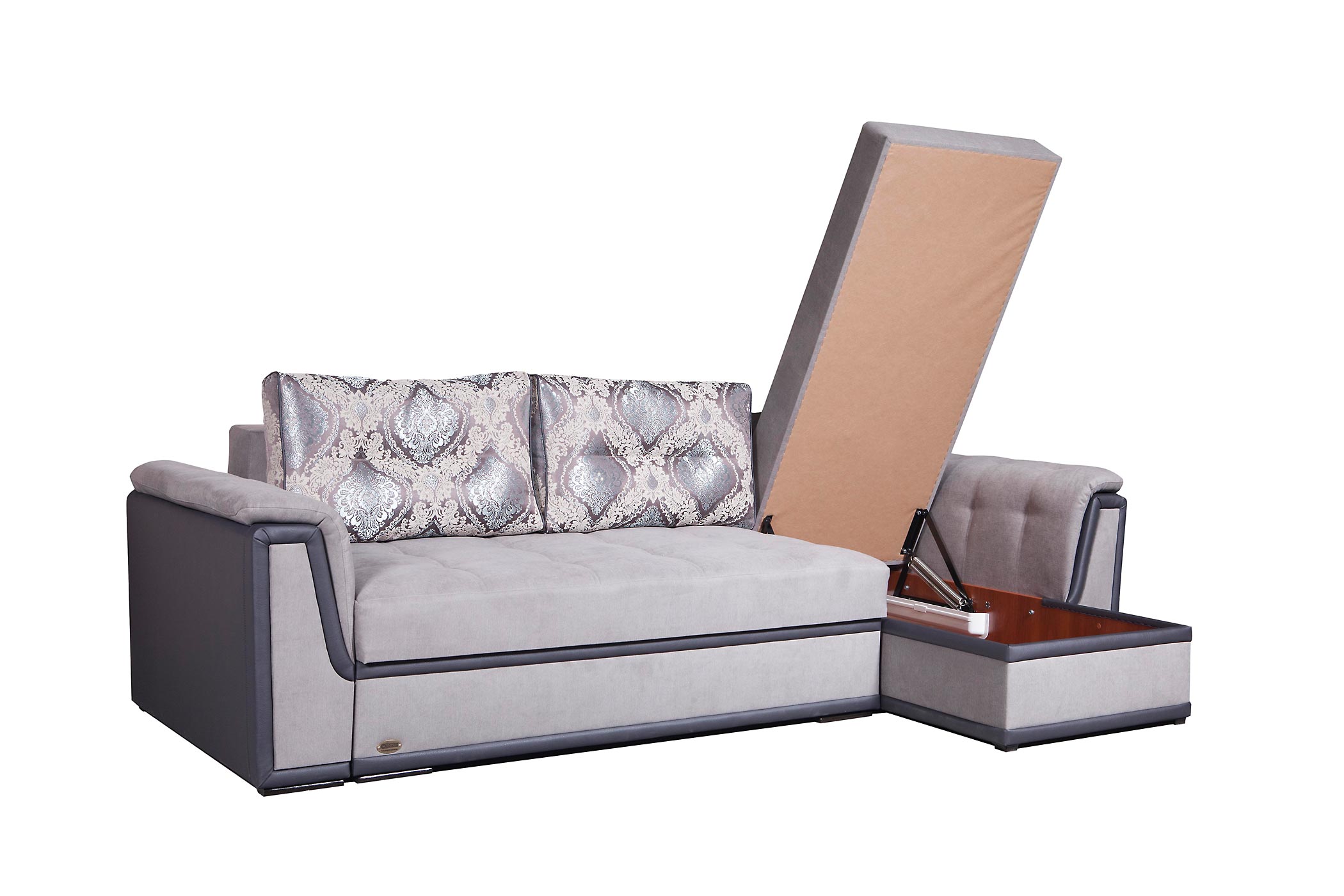 - Используется механизм «Тик-так», который позволяет легко превратить диван в полноценное спальное место. Под боковой и прямой секциями расположены вместительные ящики для хранения.