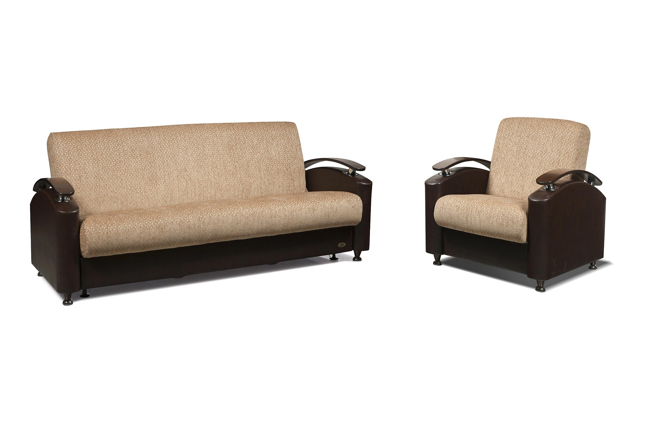 Набор включает прямой диван-кровать и два кресла. В основе их конструкции – надежный каркас из дерева. В изделиях использованы качественная экокожа и текстиль.